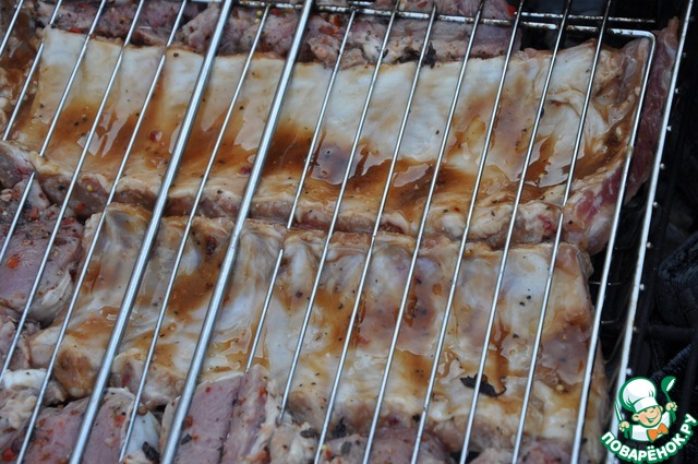 Предварительно разожгите мангал. После того, как угли все перегорели и образовался хороший жар, ставьте решётку с рёбрами запекаться. В процессе запекания не забудьте смазывать ребра маринадом.