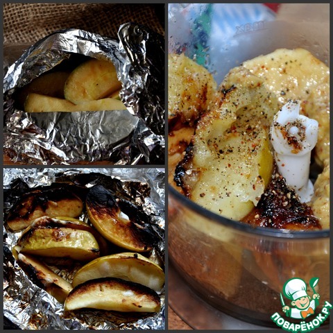 Дольки яблок заверните в фольгу и отправьте на угли. Яблоки можно запечь и любым удобным для вас способом. Готовые яблоки очистить от шкурки.