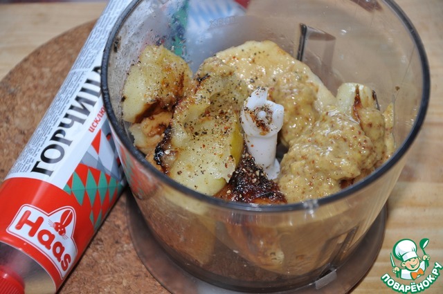 К яблочной мякоти добавить растительное масло, горчицу ( Торговой марки HAAS Баварская ), соль, перец. Измельчить блендером.