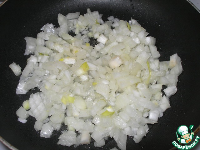 В это время нарезать мелко лук и обжарить в растительном масле на сковороде до румяности. Дать остыть.