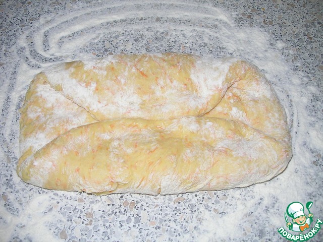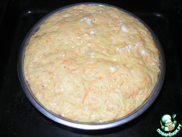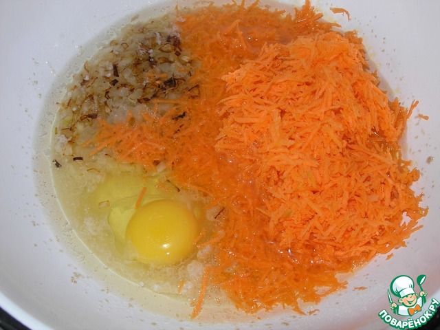 Необходимо к смеси из сыворотки, растительного масла и дрожжей добавить 1 ч. л. соли с горкой, 1 ч. л. сахара, 1 яйцо, пожаренный лук и натёртую морковь. Всё тщательно перемешать. -