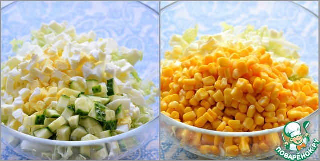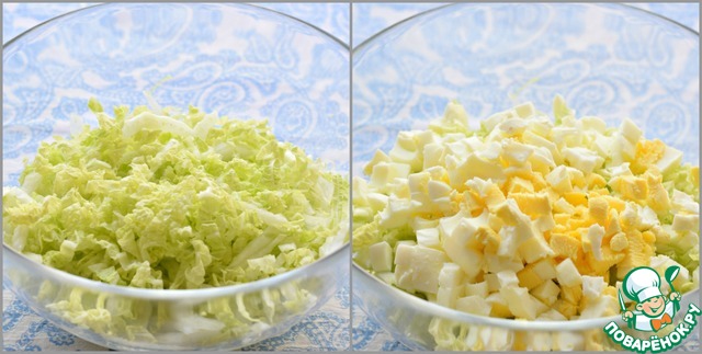 Пекинскую капусту нашинковать. Выложить в большой салатник.