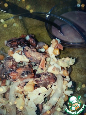 Очень хорош этот салат не только с мидиями. Можно готовить его и с морским коктейлем, и с кальмаром.