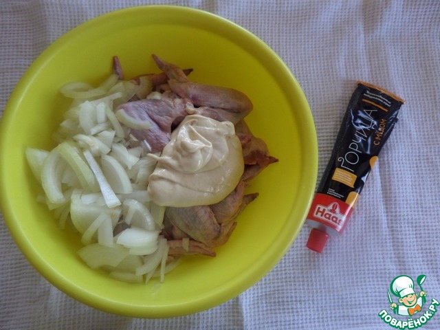 Для приготовления маринада я использую замечательную ароматную горчицу с медом ТМ "HAAS". В чашечку выкладываем майонез и соль. Добавляем горчицу с медом ТМ "HAAS".