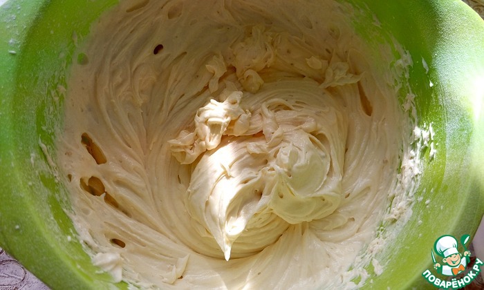 Размягчённое сливочное масло взбить с сахаром на максимальной скорости в течение 2-3 минут, до посветления.