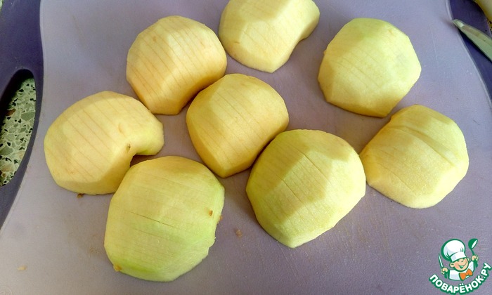 Яблоки очистить, разрезать на половинки, удалить семенную коробочку при помощи ложечки или овощечистки. Положить срезом на доску и надрезать тонкими ломтиками, не прорезая при этом до самого конца, чтобы яблоки не распались.