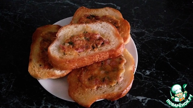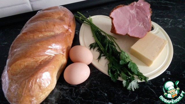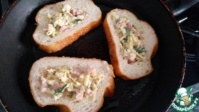 Для начинки смешиваем ветчину, сыр, зелень, кубики хлеба, яйца и соус.