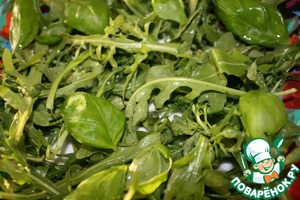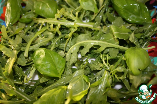 Вымыть рукколу и листочки базилика.