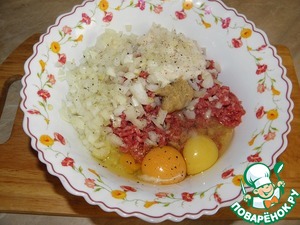 Пропустить мякоть телятины через мясорубку вместе с размоченным и отжатым хлебом. Добавить горчицу, два яйца, мелко порезанные две луковицы и хорошо приправить солью и перцем.