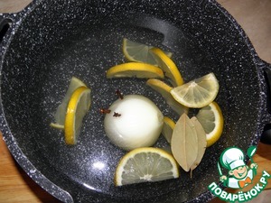 В большой сотейник налить бульон, добавить в него порезанный дольками лимон и одну луковицу в которую воткнуть три гвоздички и два лавровых листа. Довести бульон до кипения, посолить и поперчить.