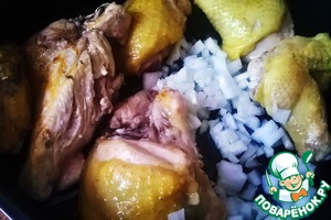 Лук мелко нарезать и добавить к курице.