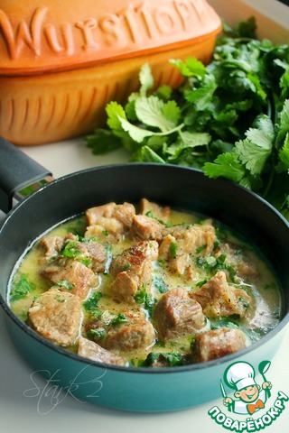 В казане жидкости почти не осталось. Всыпаем туда измельченную кинзу. Все интенсивно мешаем и прожариваем, помешивая, минуты 2.
