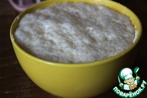 В приятно теплом молоке развести дрожжи с сахаром и просеять 100 гр муки. Все перемешать и оставить под чистой тканью в теплом месте для подъема. -