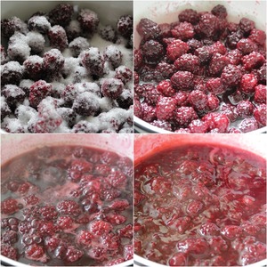 Приготовить ягодный крем (фото кликабельно). Для этого свежие или замороженные ягоды (размораживать не надо) выложить в кастрюлю или огнеупорную миску, добавить сахар по вкусу и нагревать на среднем огне, помешивая, пока ягода не даст сок.