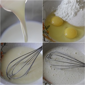 Когда молоко дойдёт до точки кипения, снять его с огня и влить треть в яичную смесь, постоянно вымешивая венчиком. -