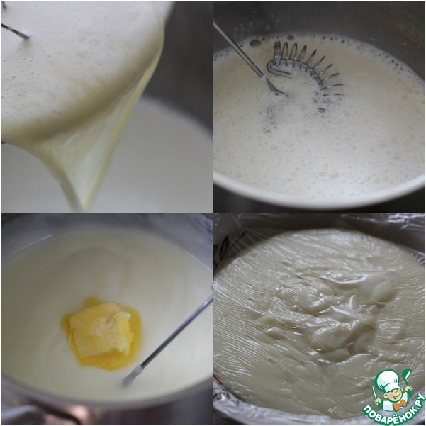 Перелить крем в холодную миску и накрыть пищевой пленкой или пергаментом, чтобы не подсыхала поверхность. -