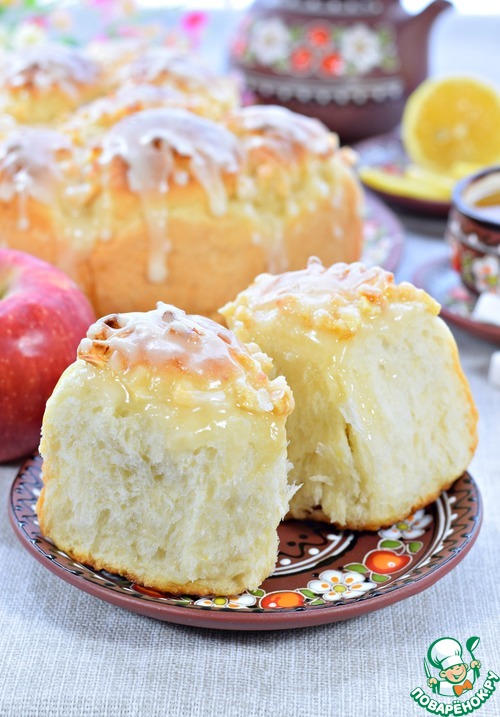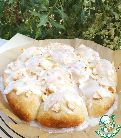 Яблочный сироп, который образовался в начинке, смешать с сахарной пудрой. Глазурь готова. Понадобится 25 мл сиропа и 100 г пудры. Если сиропа получилось недостаточное количество, то добавьте лимонный сок или воду до нужного объема.