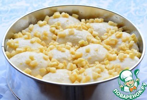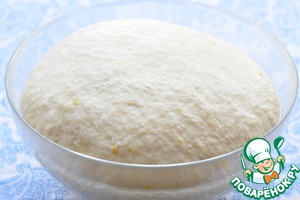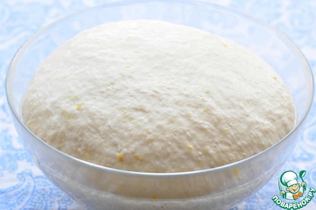 Сахар и соль растворить в теплой смеси воды и молока. Добавить кукурузное (подсолнечное) масло и цедру лимона. Муку просеять, смешать с дрожжами, всыпать к жидким ингредиентам, замесить тесто.