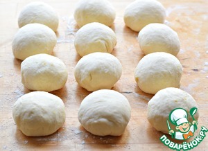 Подошедшее тесто выложить на рабочую поверхность, присыпанную мукой, обмять, разделить на 10-12 равных частей. Из каждой сформировать шарик. Прикрыть тестовые заготовки полотенцем минут на 10.