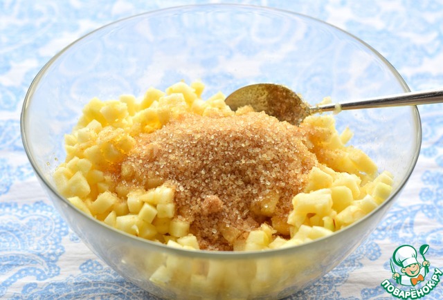 Яблоки очистить, удалить сердцевину и нарезать не очень крупно. Засыпать коричневым (или обычным белым) сахаром, перемешать. Раньше готовить яблочную начинку не стоит, так как яблоки могут дать слишком много сока.