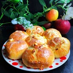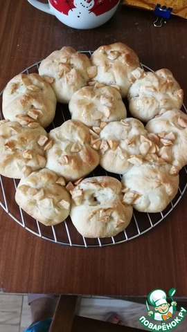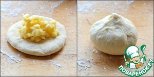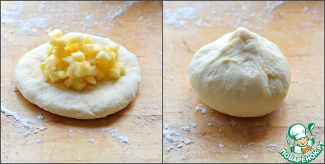 Их каждого тестового шарика раскатать лепешку (d 9-10 см), в середину выложить 1,5-2 чайные ложки яблок. Собрать все края лепешки в узелок, тщательно слепить.