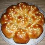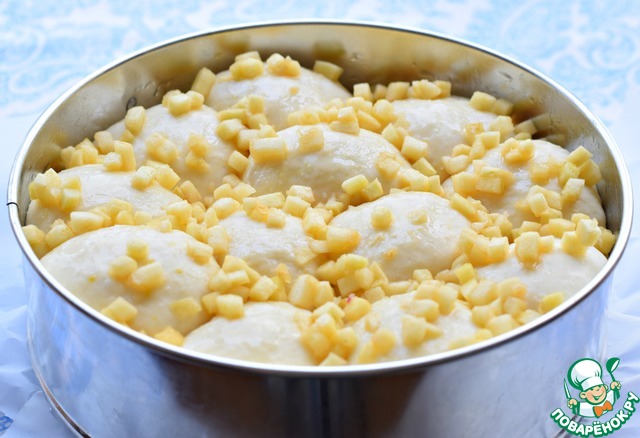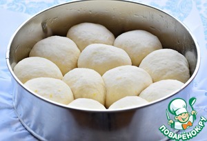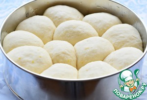 Булочки выложить в форму. (d 21-22 см) Дно формы лучше простелить пекарской бумагой и смазать дно и бока формы растительным маслом.