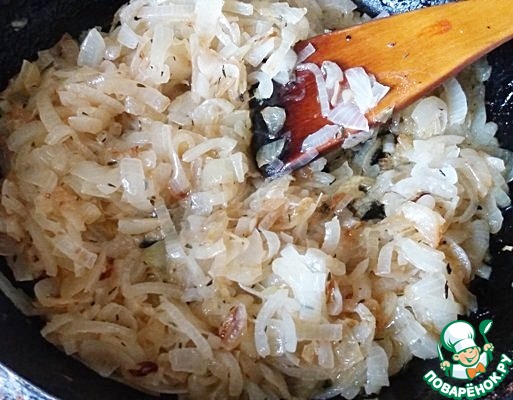 Лук нарезать тонкими полукольцами и обжарить до мягкости. Сюда же при обжаривании лука добавить свежий или сушеный тимьян.