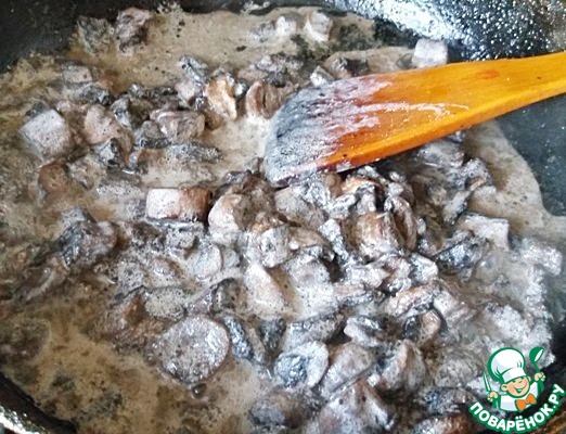 В отдельной сковороде обжарить грибы до готовности. В конце добавить сметану. А также соль и перец по вкусу.