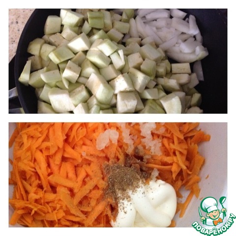 Баклажаны очистить, нарезать средним кубиком как и лук. Обжарить сначала на сильном огне, затем огонь убавить и жарить овощи до готовности. Готовые баклажаны с луком выложить в дуршлаг, чтобы стекло лишнее масло. Тем временем морковь натереть на крупной терке. Добавить чеснок пропущенный через пресс, зиру молотую и майонез. Перемешать.