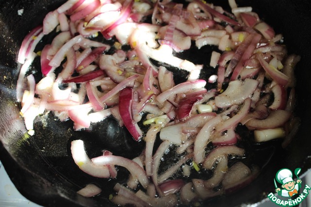 На раскаленную сковородку, смазанную растительным маслом, выложить нарезанный четверть кольцами лук, добавить сливочное масло и жарить до прозрачности лука.