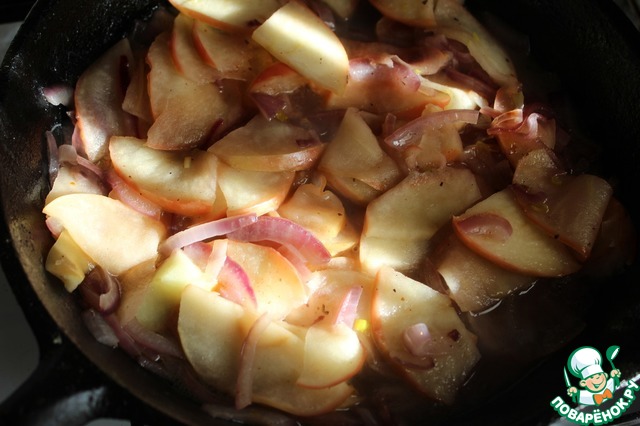 К луку выкладываем нарезанные тонкими ломтиками яблоки, солим, перчим, добавляем мед и воду, мускатный орех. Все перемешать и оставить под крышкой на минимальном огне минут на 5-7 до размягчения яблок. Попробовать на соль, сахар. Заливка должна быть сладко-соленая.