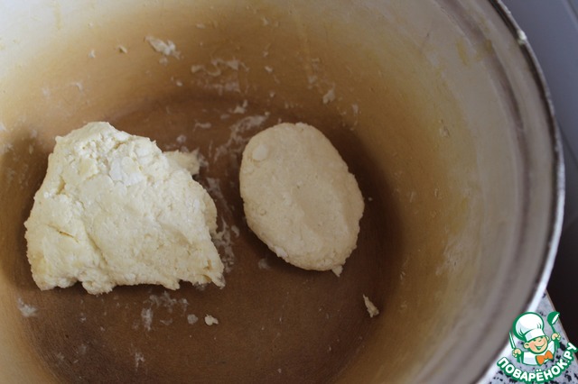 Поставить на плиту кастрюлю с 2 литрами воды и 1 ч. ложкой соли кипятиться. Взбить яйца с медом и солью. Добавить творог. Все хорошо размешать ложкой. Постепенно вводить муку по 50 грамм. Последние 50 грамм по 1 ст. ложке. На последних 50 грамм смазываем ручки оливковым маслом и хорошо вымешиваем тесто руками. Оно должно быть чуть липковатое и почти не приставать к смазанным маслом рукам.