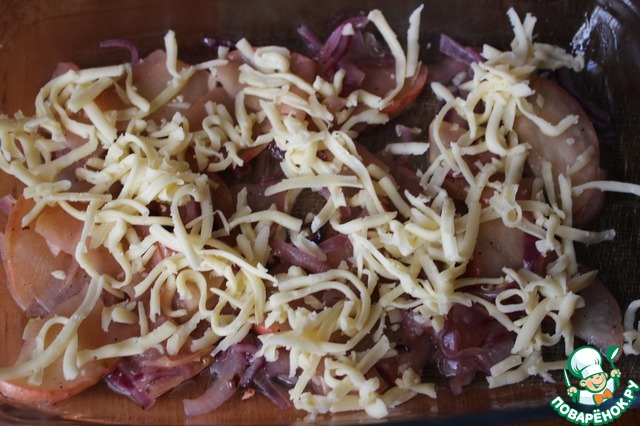 Духовку разогреть до 180 градусов. В смазанную растопленным маслом форму выкладываем 1/2 часть заливки, равномерно распределяем ее по дну. Далее 1/3 часть натертого на крупной терке сыра.
