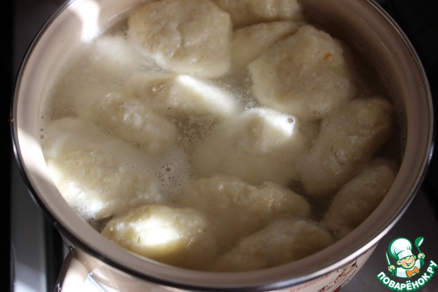Как только галушки поднимутся на верх, вынуть их шумовкой и выложить на сыр.