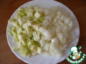 Лук и кабачок нарезать мелкими кубиками. Кабачок бланшировать 3 минуты в кипятке. Остудить.