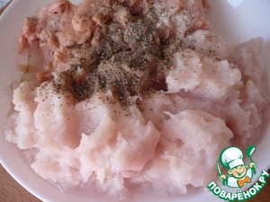 Филе семги и хека измельчить в блендере. Посолить и поперчить по вкусу.