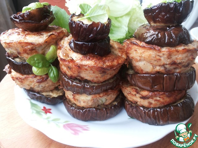 Собрать пирамидку из рыбных котлет и баклажанов. На низ тарелки выложить обжаренные кабачки, затем кружок баклажана, на него котлету. Сверху снова баклажан, котлета и завершить баклажаном. Полить рыбные котлеты соусом и украсить базиликом. Сразу подавать.