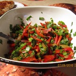 Хочу предложить быстрый, вкусный, сочный, хрустящий, пикантный салат-закуску из баклажанов с болгарским перцем. Остроту салата регулируйте сами, добавив больше перца чили или чеснока. Готовое блюдо подают как закуску или овощной гарнир к основным блюдам из мяса. Идею увидела в инете, автору огромное спасибо.