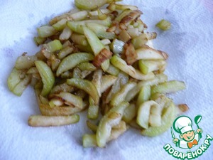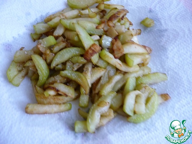 Обжарить баклажаны в разогретом масле до легкого румянца (предварительно отжатые от сока). Периодически помешивая. -