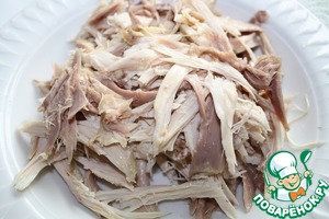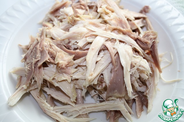 Готовую курицу разобрать на маленькие кусочки.