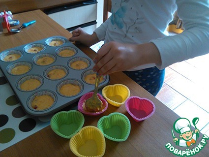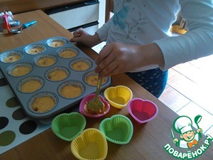 Распределяем нашу массу по формочкам, если есть-лучше силиконовые, хорошо отстают. У меня этим занималась дочь.)))