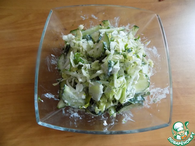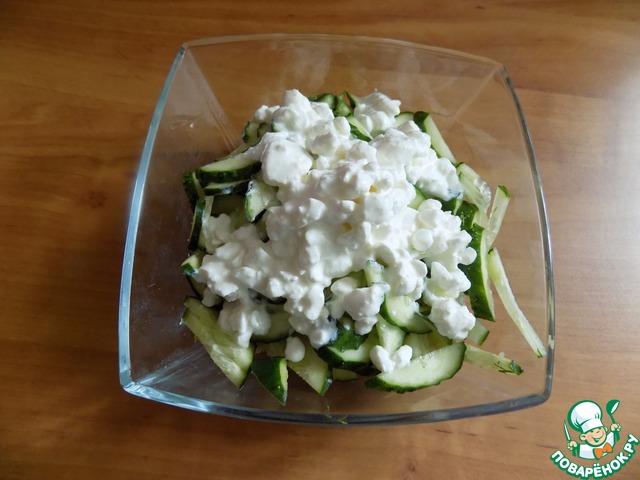 Огурцы режем соломкой, зелень режем мелко. Отправляем всё к капусте и выкладываем зернистый творог без жидкости.