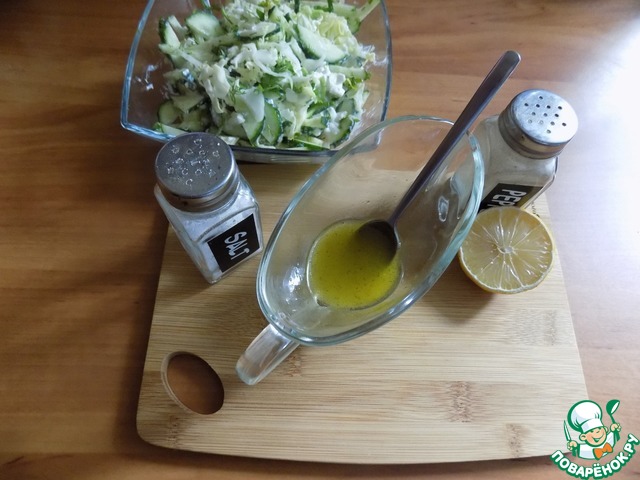 Делаем заправку. В оливковое масло отжимаем лимонный сок, солим и перчим по вкусу. Перчить не обязательно, если есть салат будут дети.