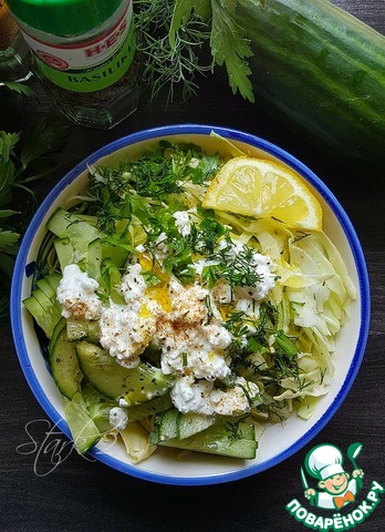 Салат с молодой капустой, огурцами, зеленью и зернистым творогом, заправленный оливковым маслом с лимонным соком. Свежий, очень вкусный и конечно же полезный!