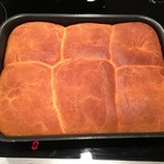 Разделить тесто на 8 шариков. Каждый шарик раскатать в лепешку, положить начинку и сформировать круглые булочки. Растопить оставшееся масло, смазать им форму, выложить булочки, накрыть пленкой и оставить еще на 1 час. После этого смазать булочки растопленным маслом и убрать в горячую духовку на 20-25 минут. Остудить и посыпать сахарной пудрой.