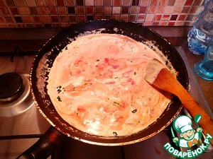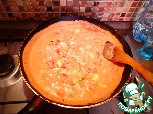 В сковородку одновременно выливаем сметану и консервированные помидоры/томатную пасту. Добавляем соль, чеснок и чили.