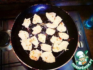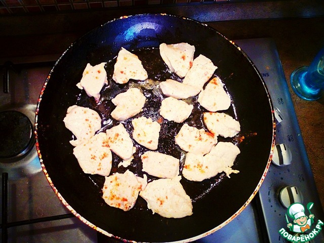 Куриную грудку промоем, нарежем небольшими кусочками и обжарим с любыми специями на ваше усмотрение.