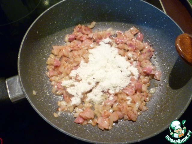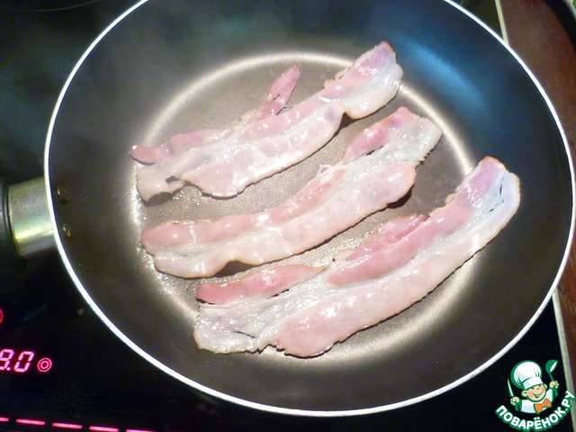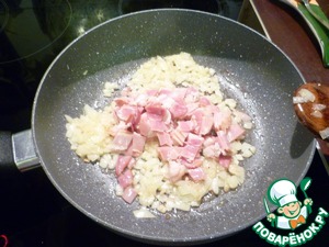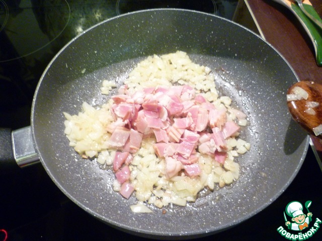 Добавить бекон, перемешать и обжарить пару минут помешивая