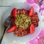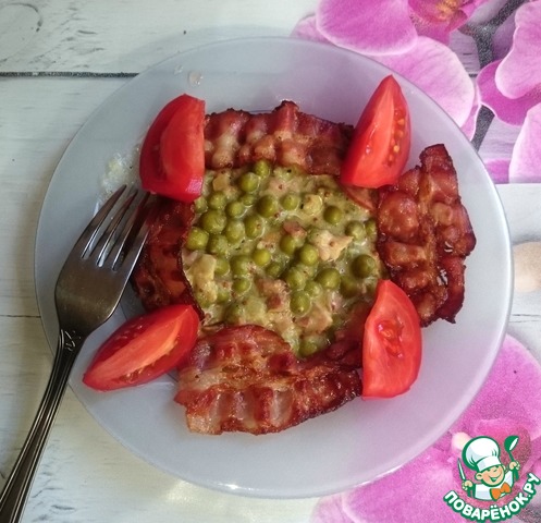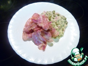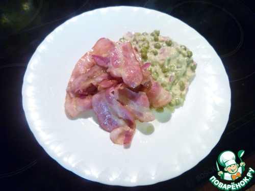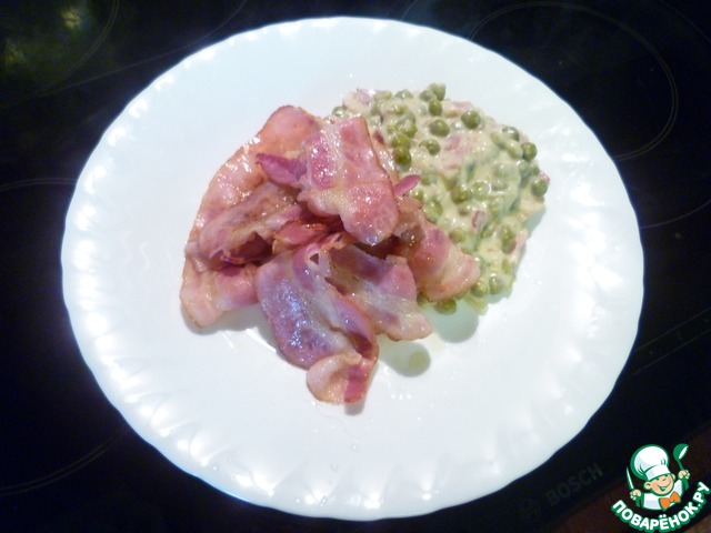 Добавить бекон к горошку и подать к столу горячим