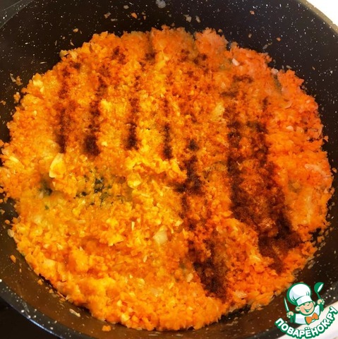 Овощи обжарить на смеси растительного и сливочного масла. Добавить томатную пасту. Пережарить минут 5 все вместе.